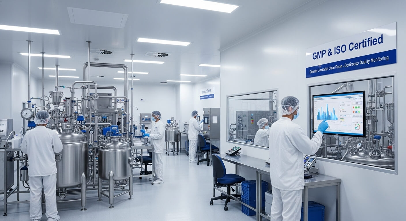 Our GMP & ISO certified facility maintains the highest standards with climate-controlled clean rooms and continuous quality monitoring.